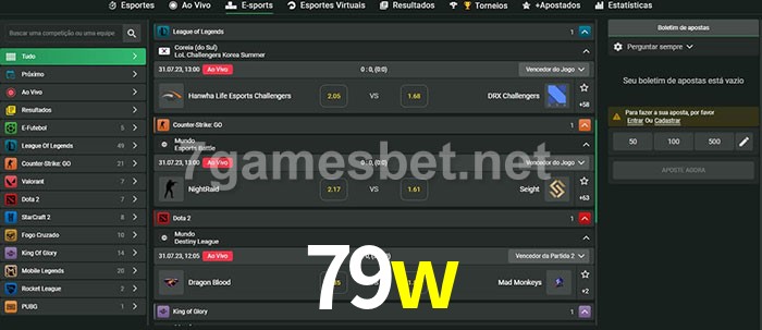 O 79w oferece uma grande seleção de opções de apostas em e-sports com probabilidades competitivas